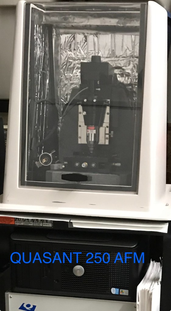 The Quesant 250 AFM (Atomic Force Microscope) is a surface imaging system with specifications including a 6″ x 6″ maximum sample stage, a 65 mm maximum sample height, and a motorized Z-translation stage. It features an integrated 200X video microscope for sample viewing.